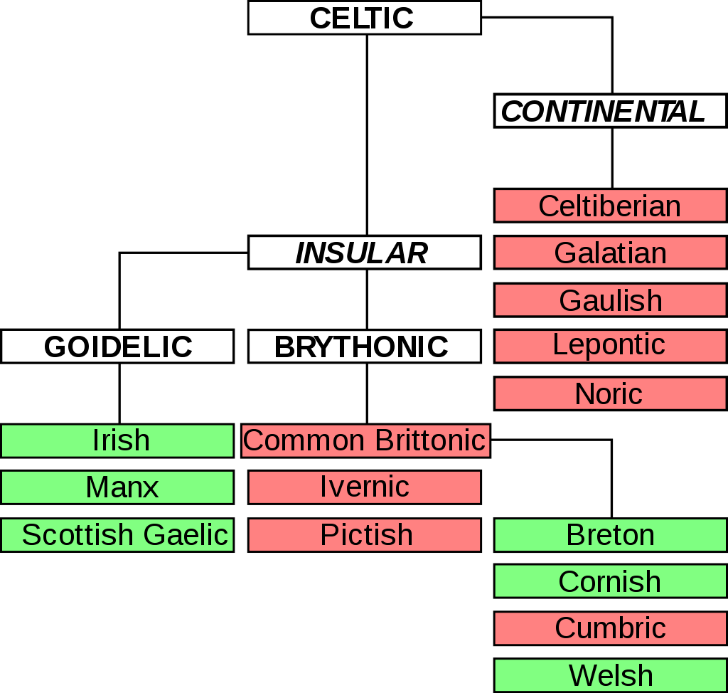 As you can see from the language family tree, Goidelic and Brythonic are two distinct branches of the language tree.