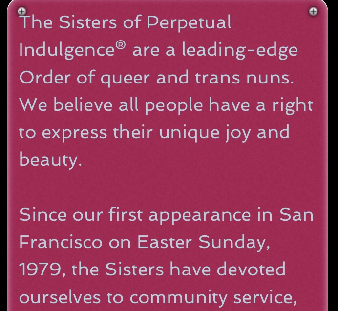 What a wonderful group. I didn’t know it was possible to be a nun outside of an established religion bound together by ‘vows to Promulgate Universal Joy and Expiate Stigmatic Guilt’. Thank you for sharing the link to their ‘sistory’ and raising awareness of their struggles.